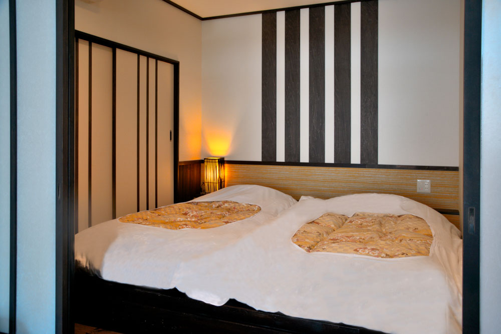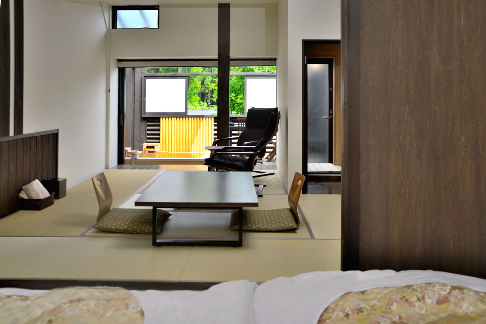 モダンな古民家テイストといった趣のお部屋です。窓際の広縁に置かれたチェアに腰掛け、ゆったりとおくつろぎくださいませ。