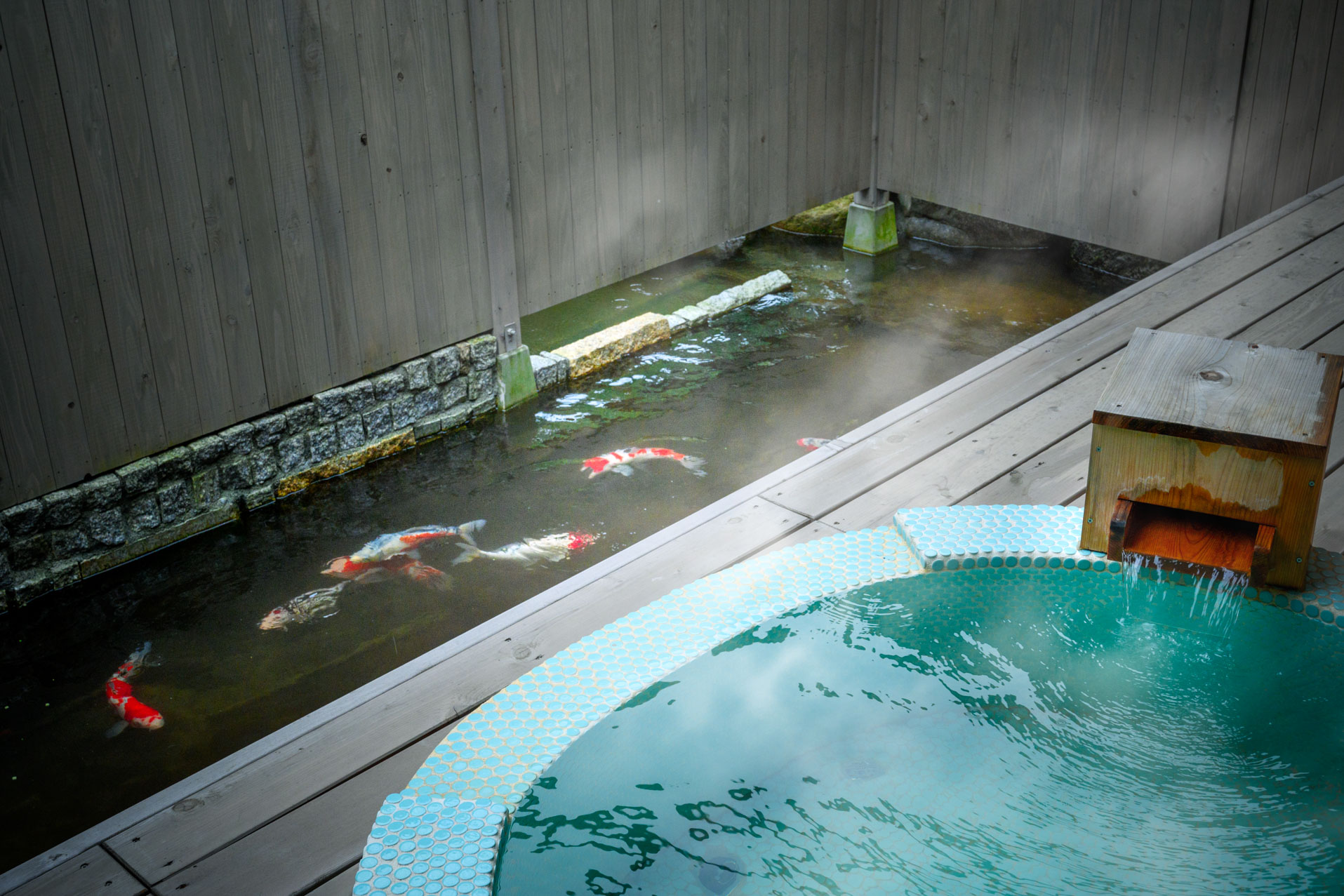池にせり出したデッキに設けられた、まるで水玉のようなモザイクタイルで作られた円形の露天風呂。