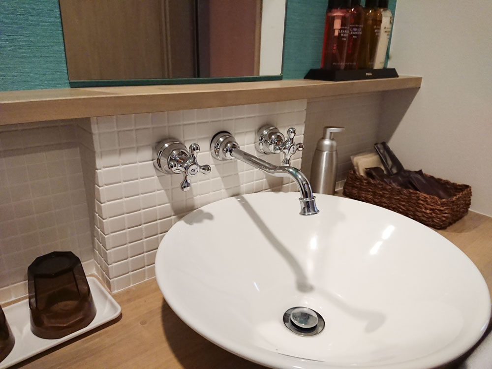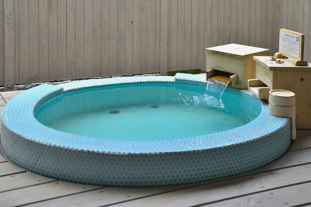 池にせり出したデッキに設けられた、まるで水玉のようなモザイクタイルで作られた円形の露天風呂。