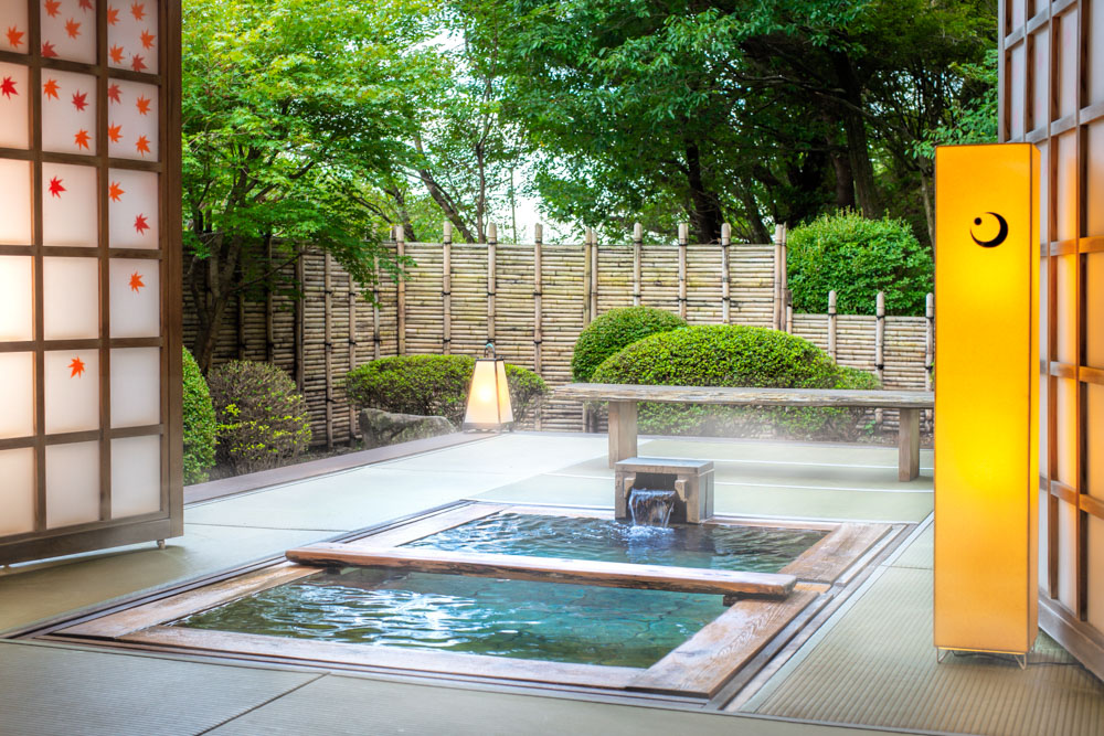 畳素材の床の露天風呂です。自由なレイアウトができる障子で閉鎖的な空間も演出できます。露天風呂には洗い場のある内風呂が併設されています。